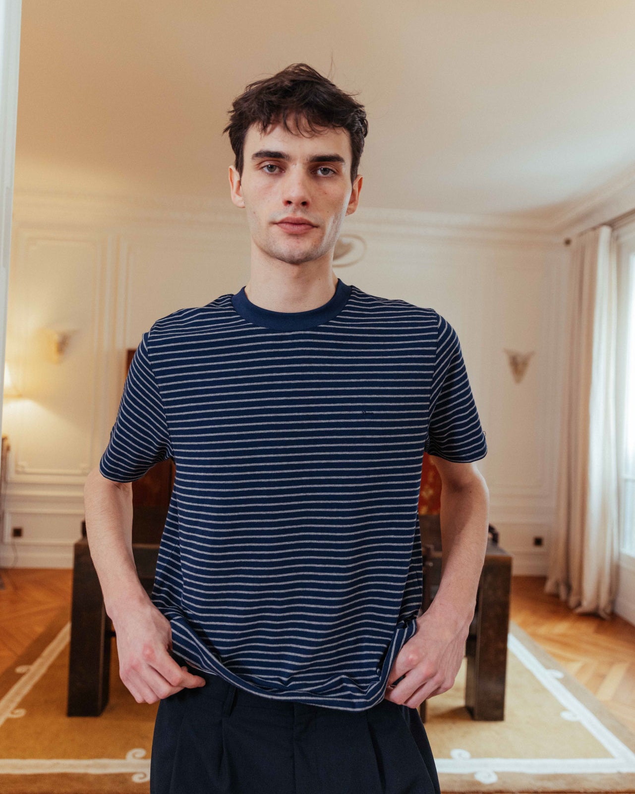 • Navy with grey stripes