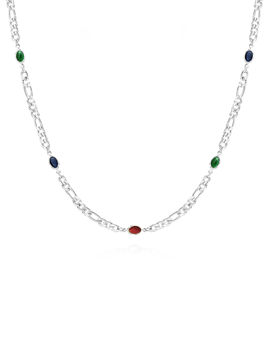 The necklace you've been dreaming about, Aubrey is the definition of love at first sight. It features multicoloured cubic zirconia gemstones set in a Figaro chain that interlocks each stone with elegance. Made from stainless steel, it’s waterproof and tarnish-free, ensuring it remains beautiful wear after wear.