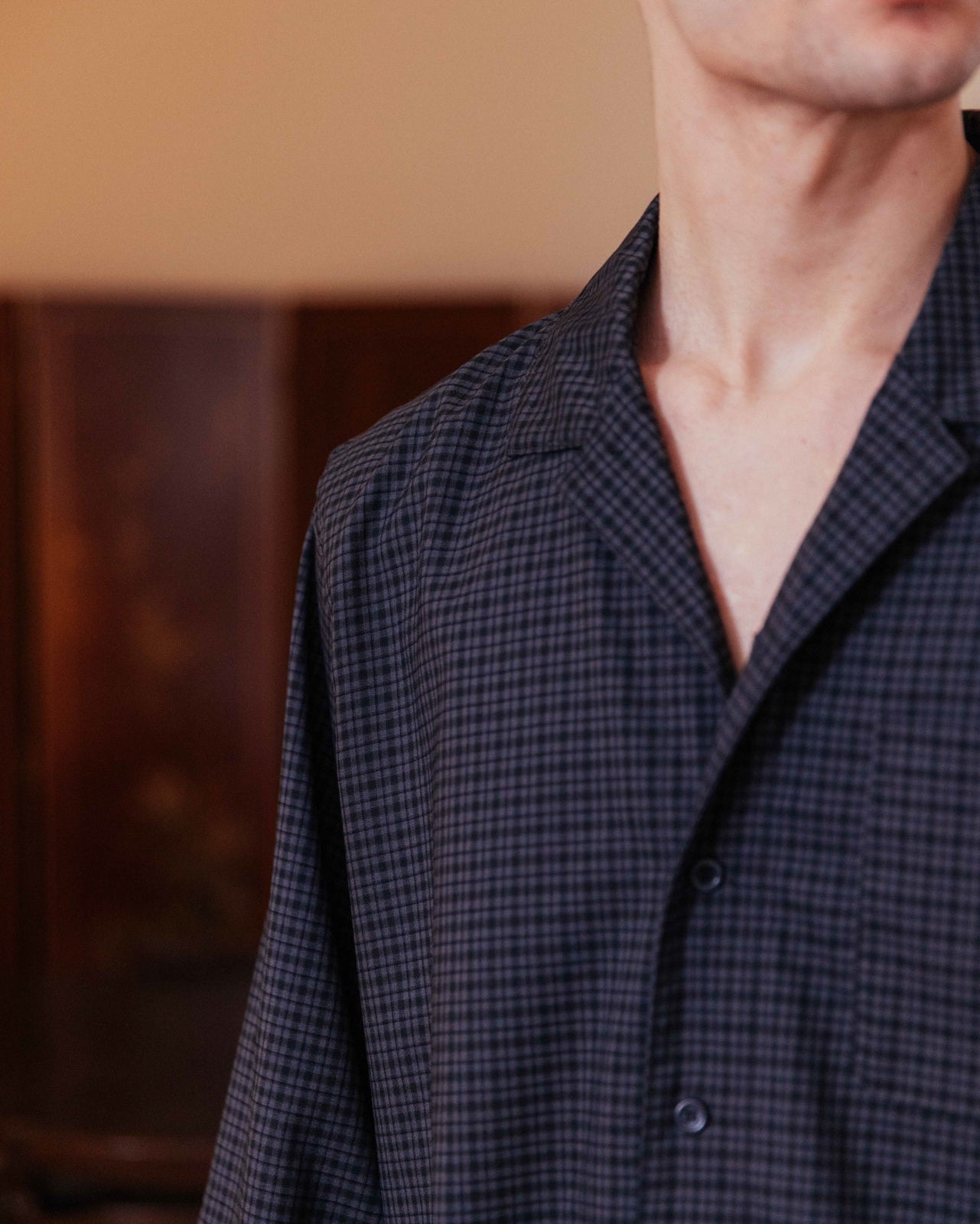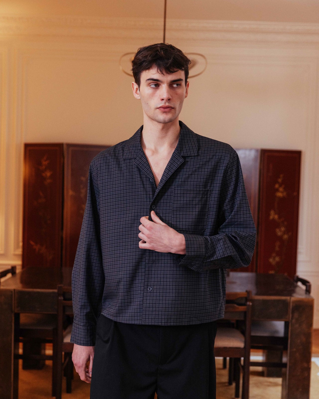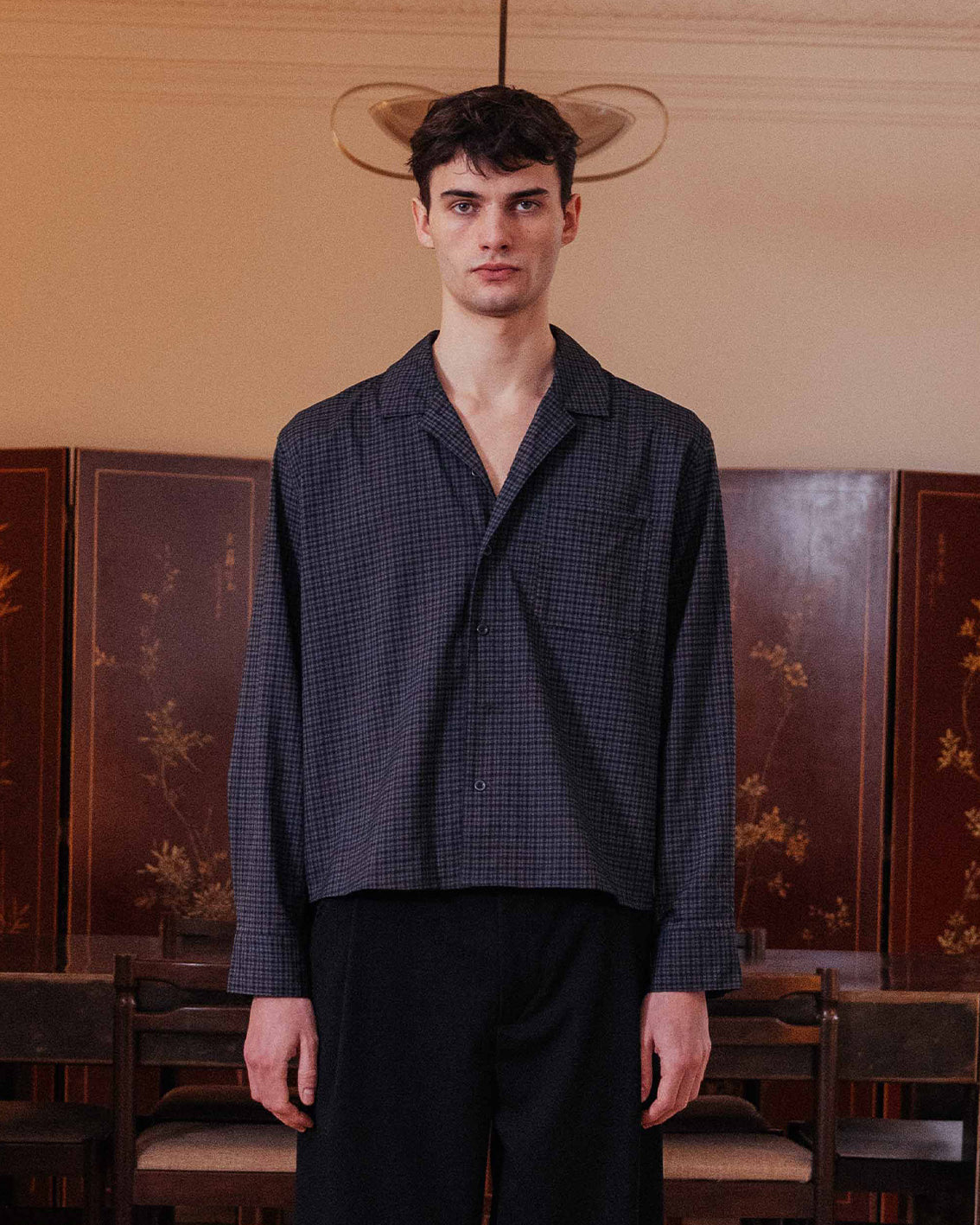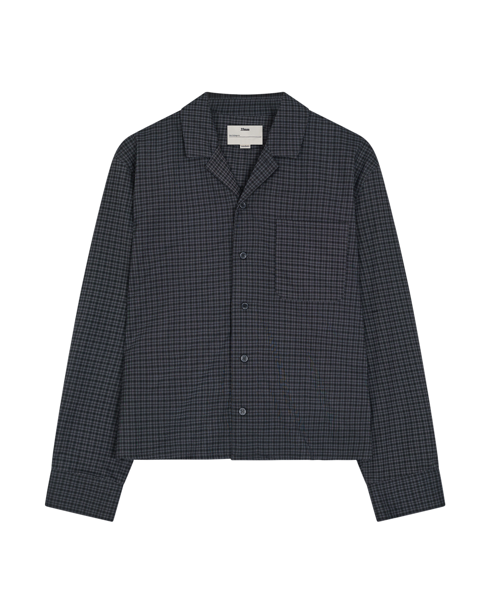 A dark grey checked shirt with a relaxed collar and an effortless boxy fit. It features a single chest patch pocket and a stepped hem, enhancing its casual, floaty feel.