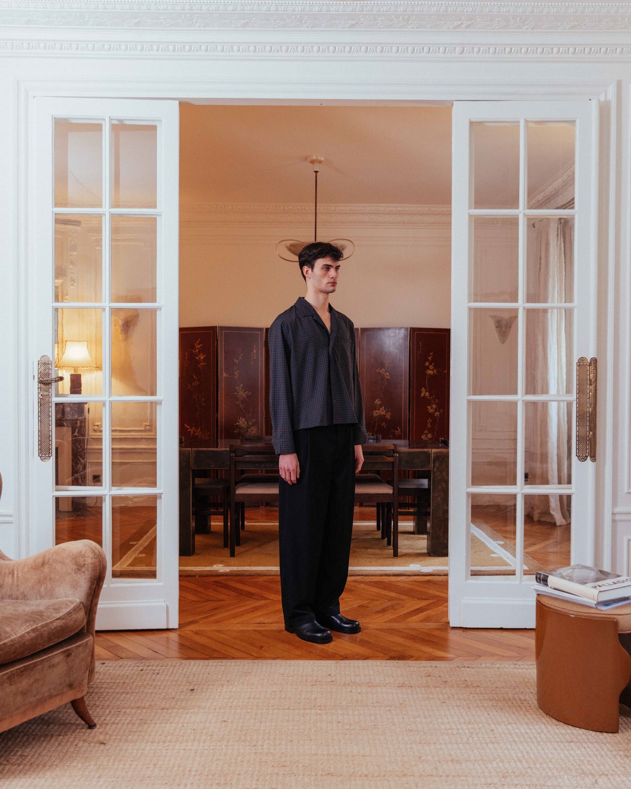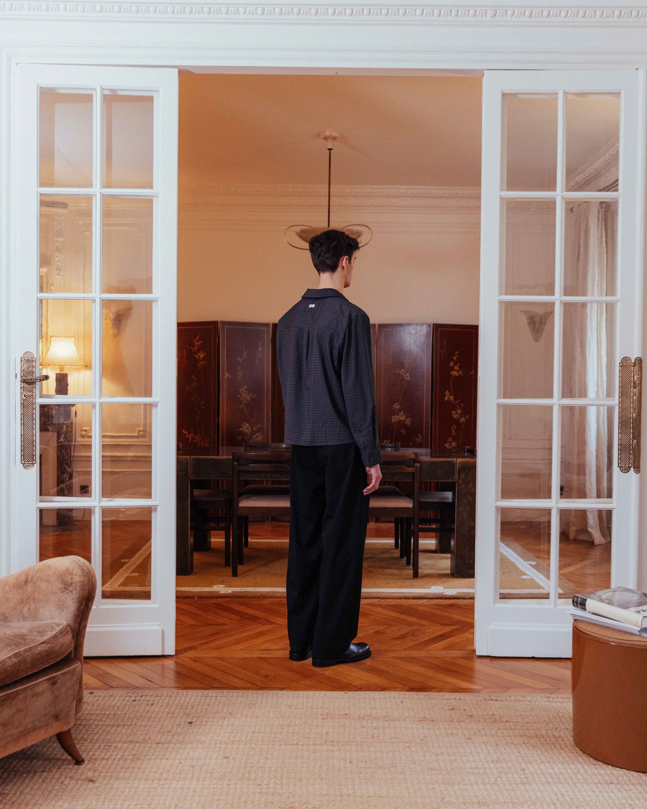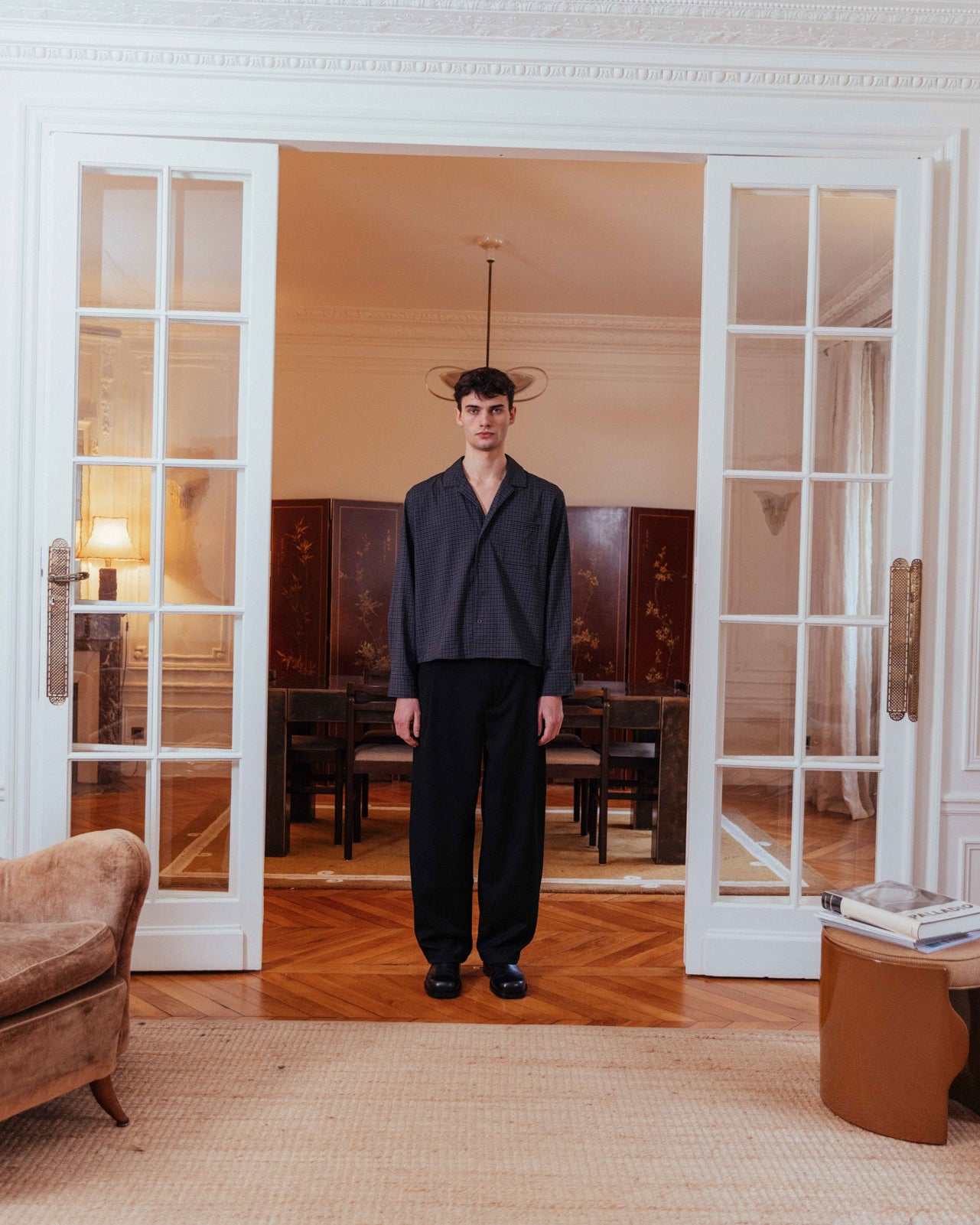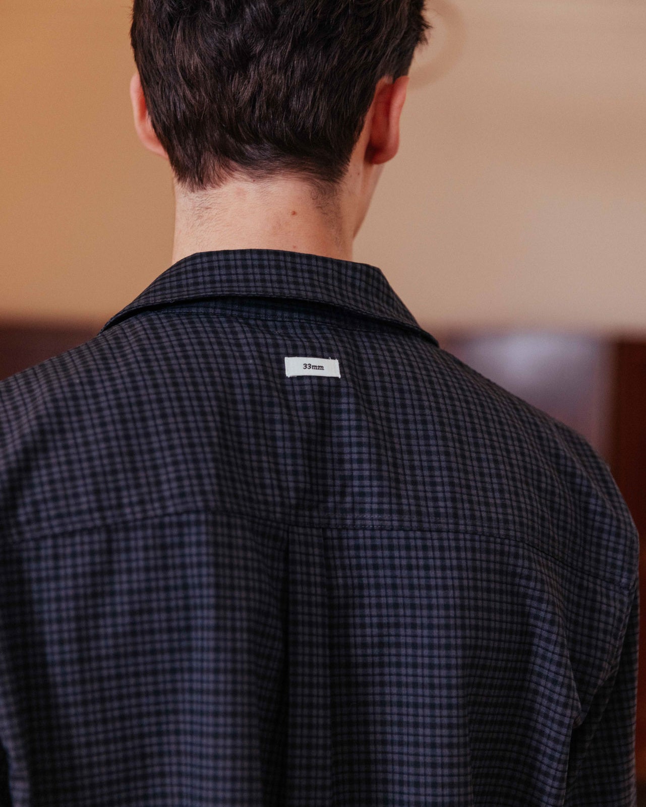 A dark grey checked shirt with a relaxed collar and an effortless boxy fit. It features a single chest patch pocket and a stepped hem, enhancing its casual, floaty feel.