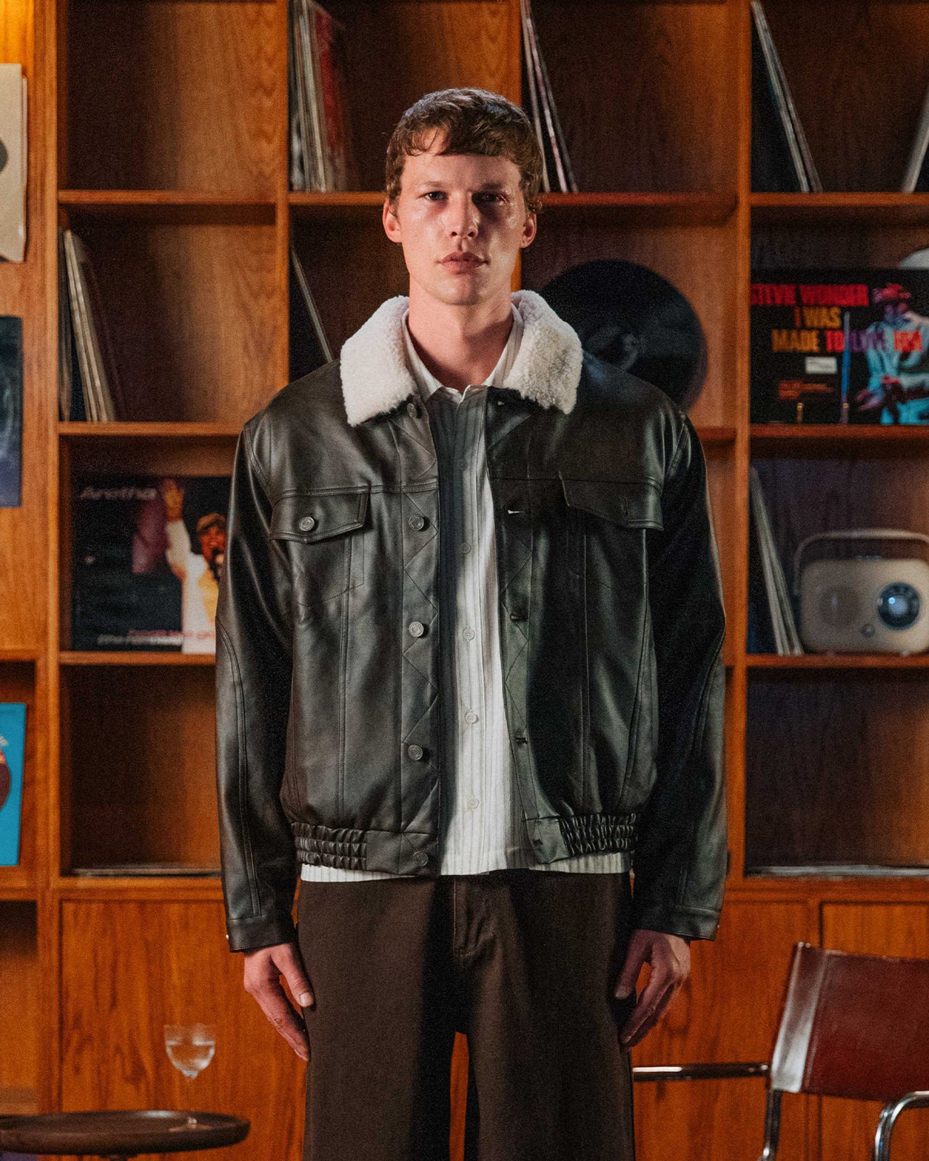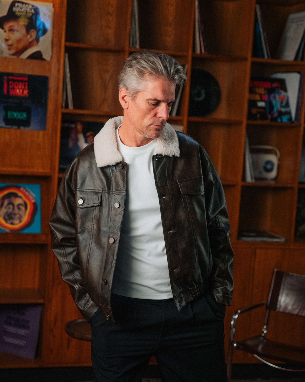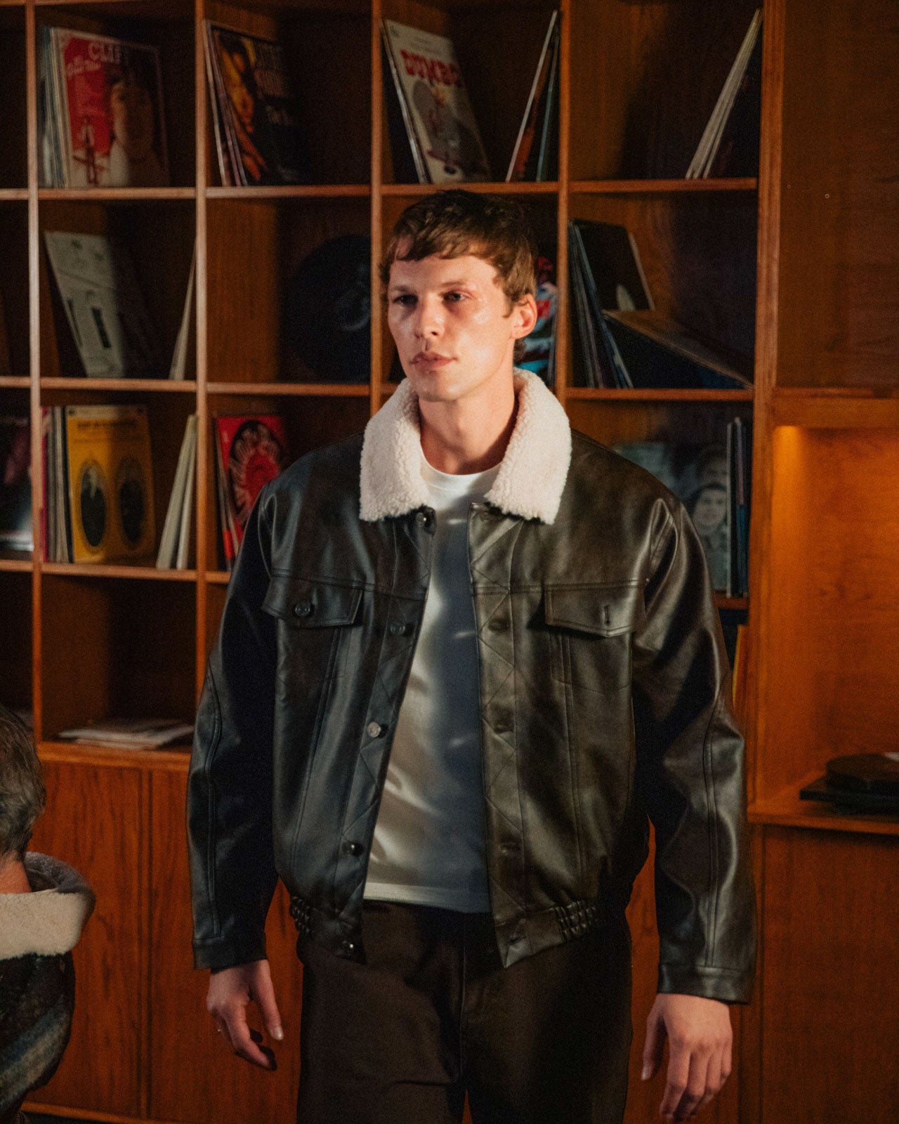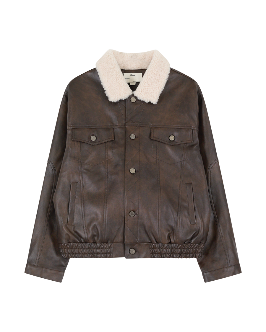 A vintage inspired vegan leather jacket with a contrast borg collar. Crafted from premium marbled vegan leather with intricate details from its stitched placket to custom metal hardware.