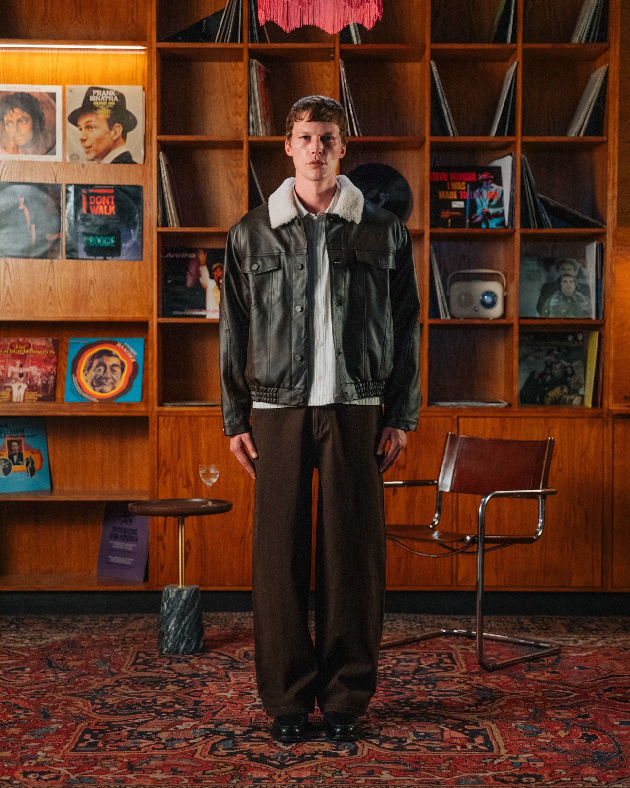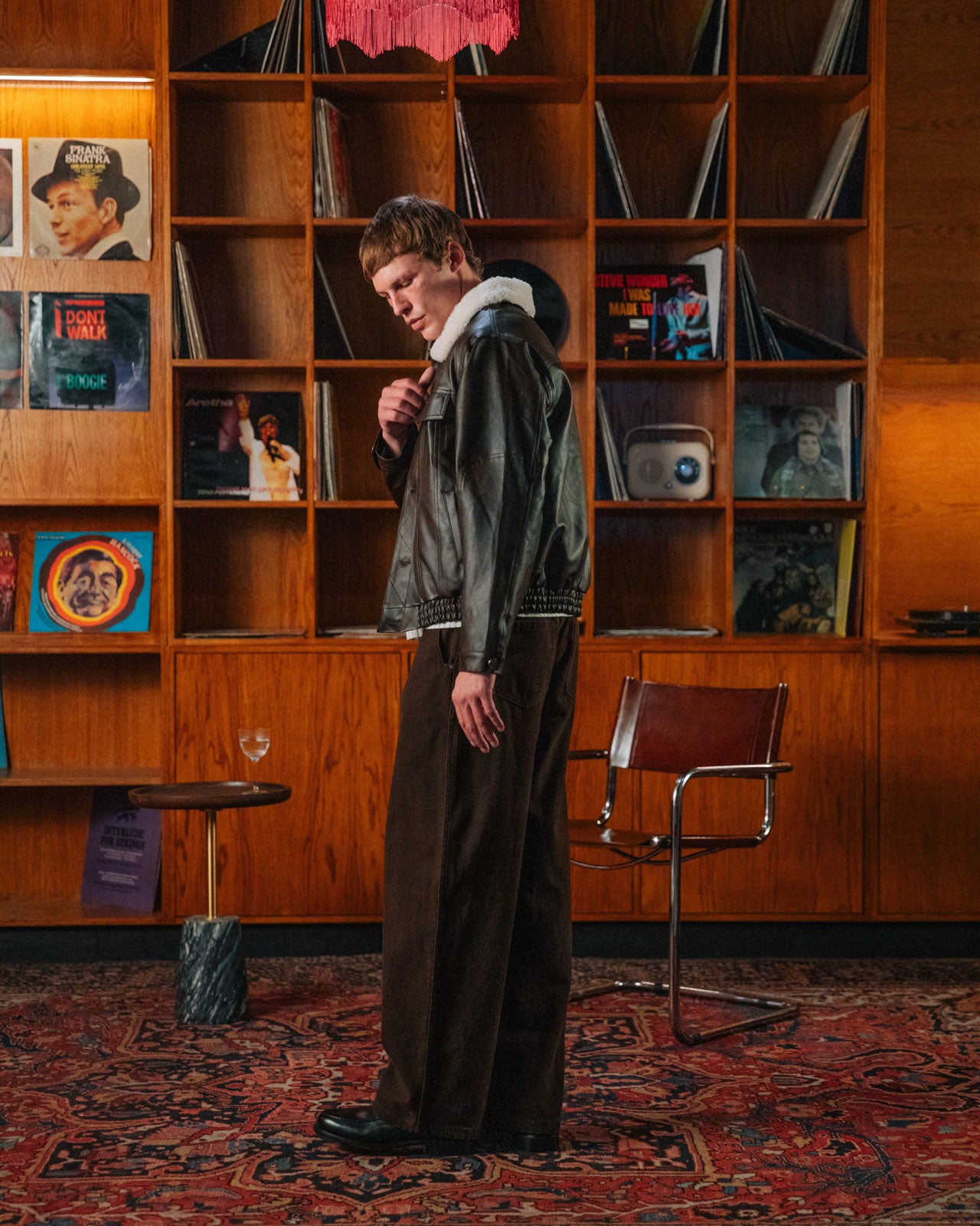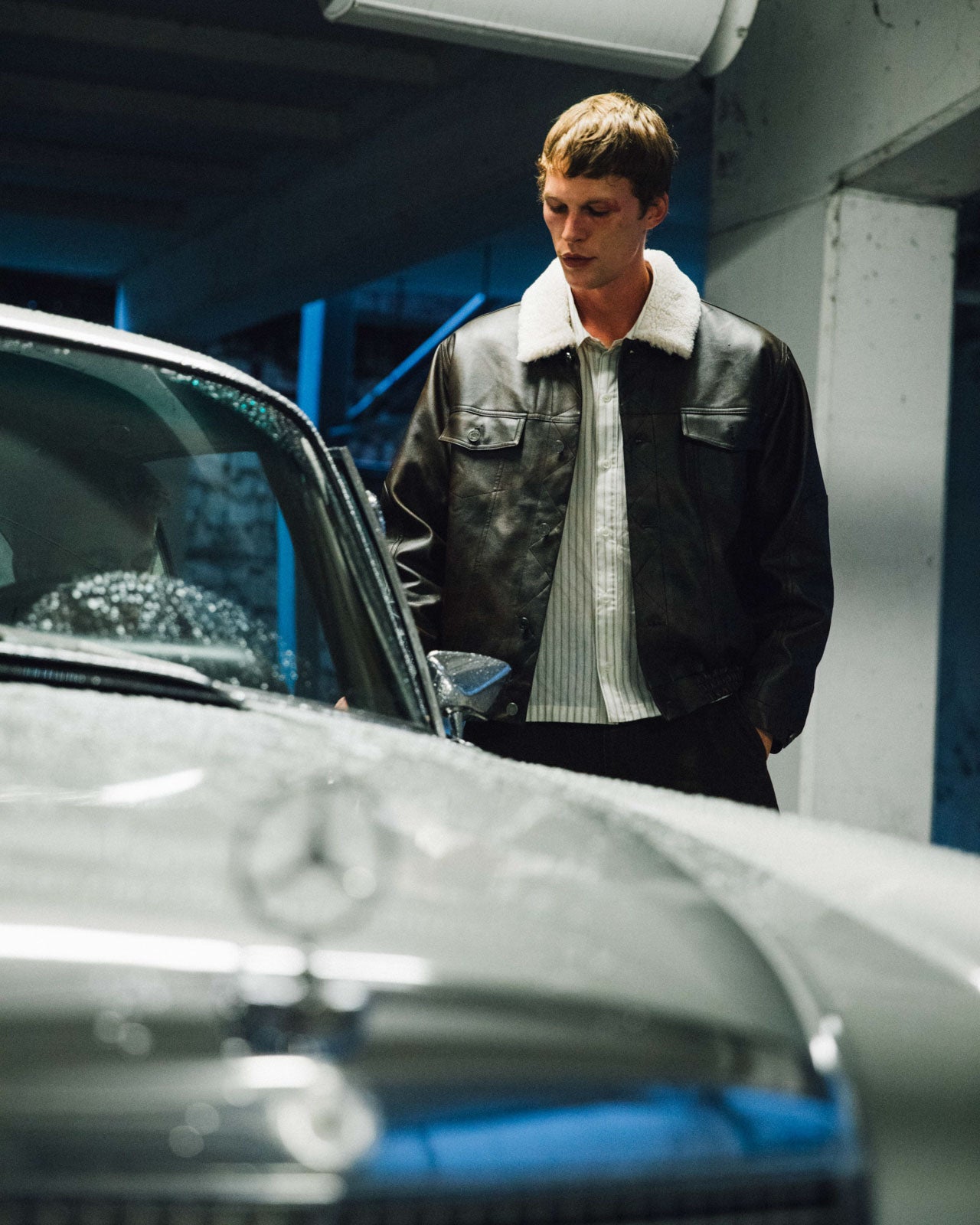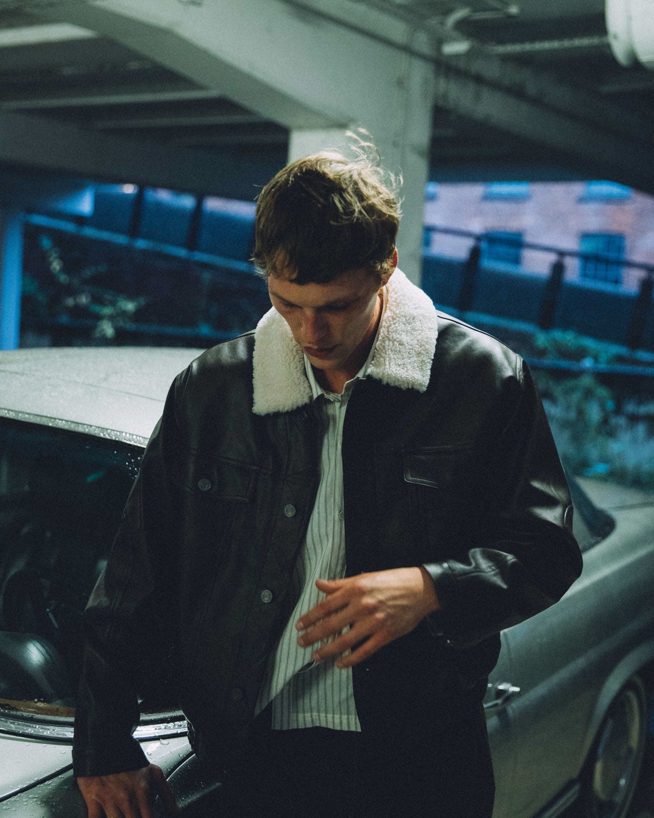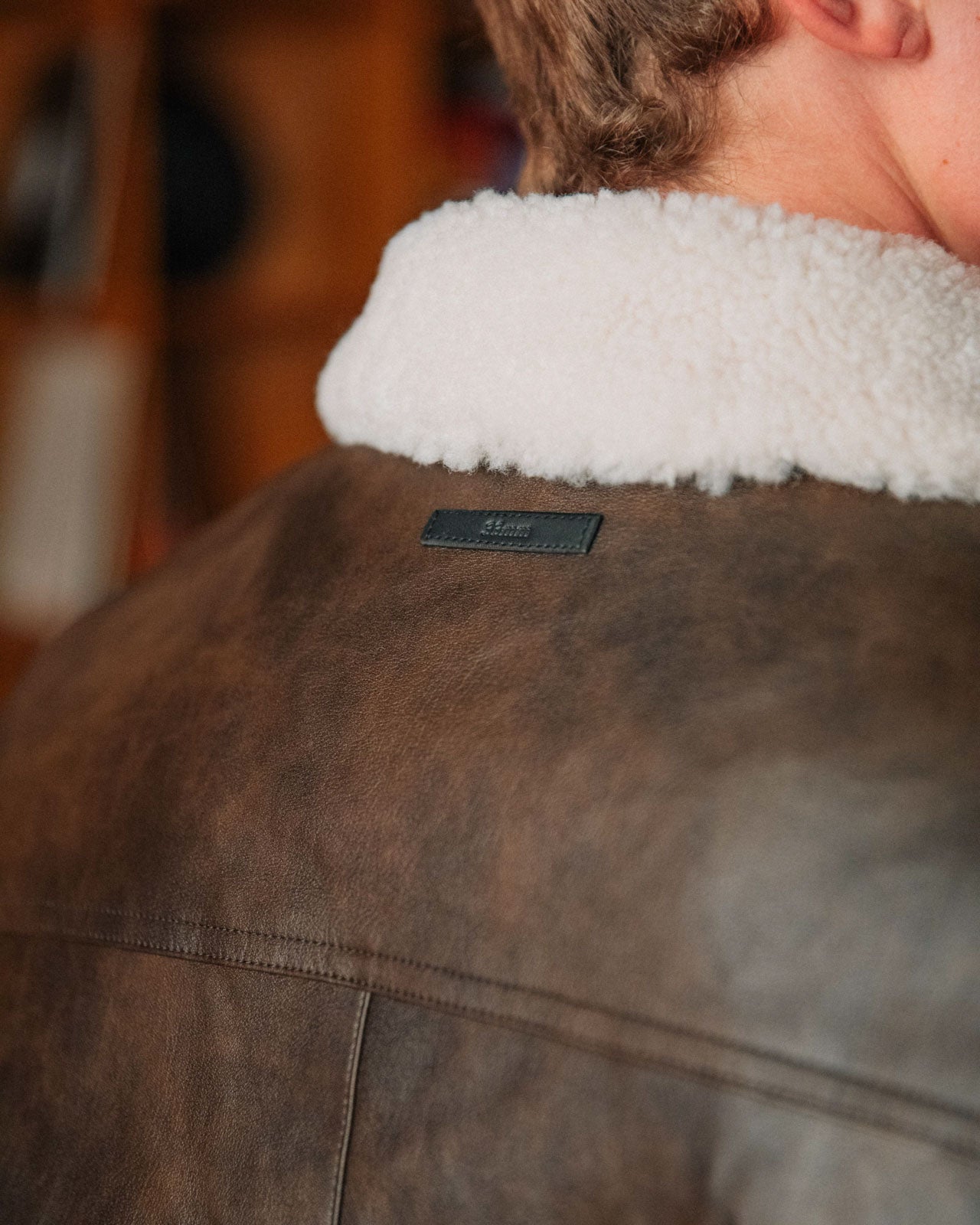 A vintage inspired vegan leather jacket with a contrast borg collar. Crafted from premium marbled vegan leather with intricate details from its stitched placket to custom metal hardware.