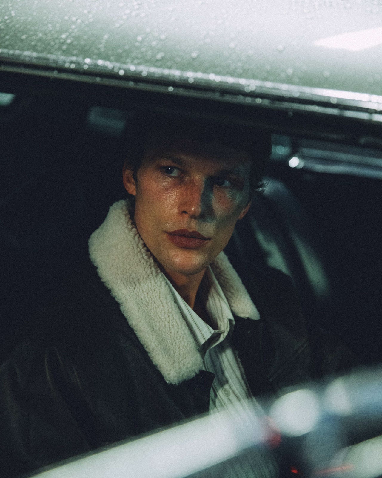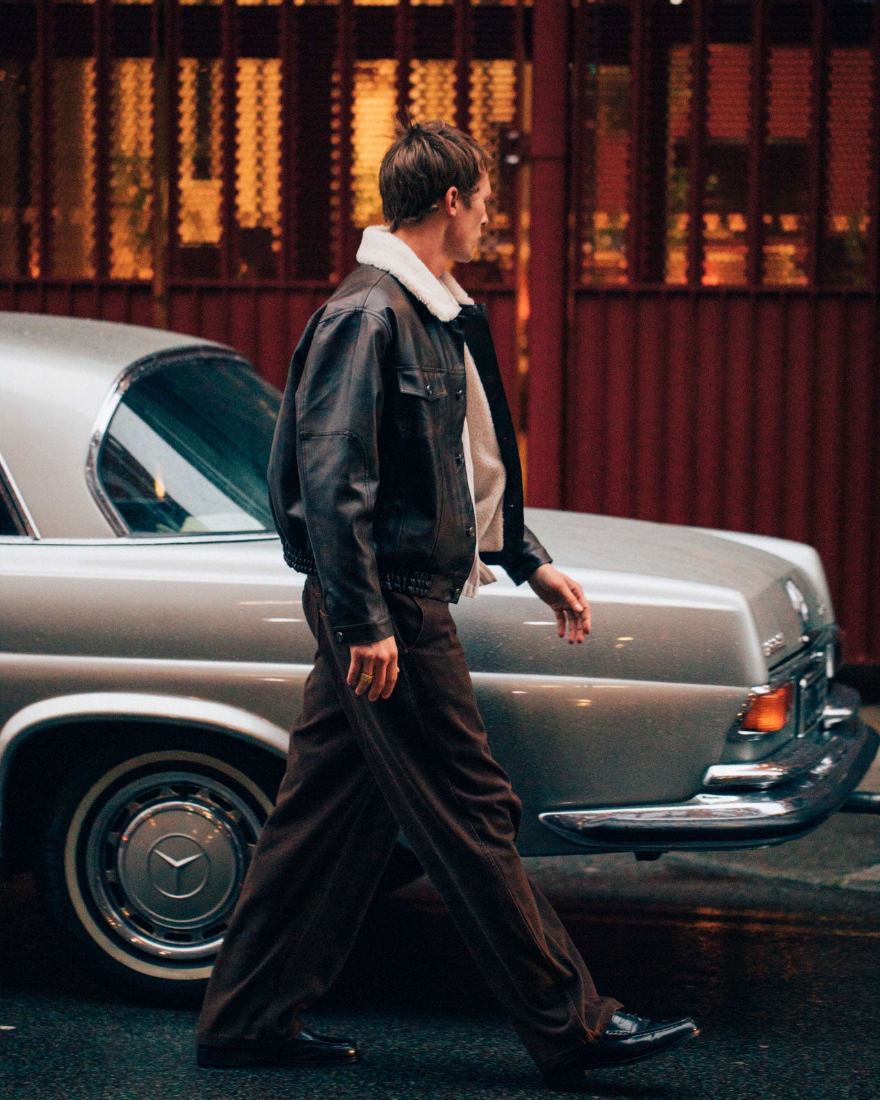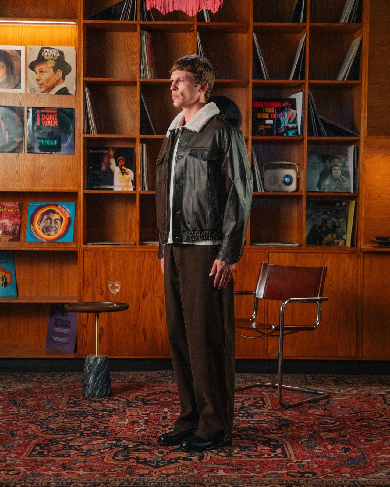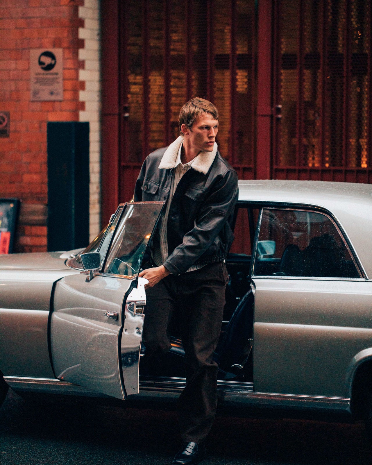 A vintage inspired vegan leather jacket with a contrast borg collar. Crafted from premium marbled vegan leather with intricate details from its stitched placket to custom metal hardware.