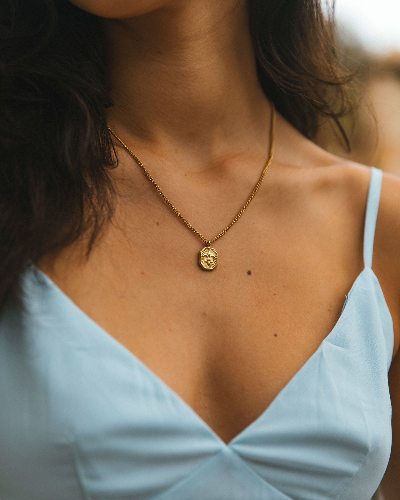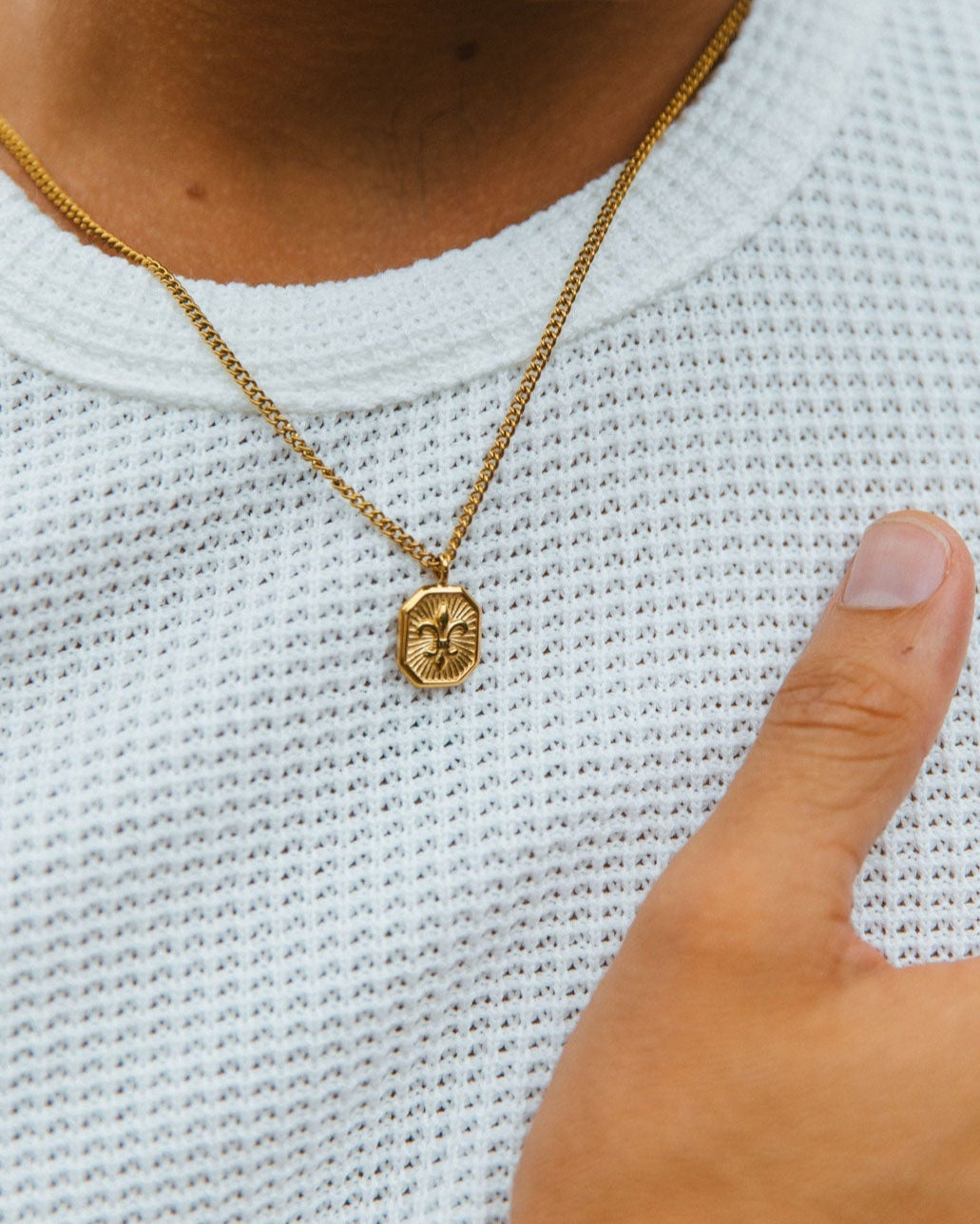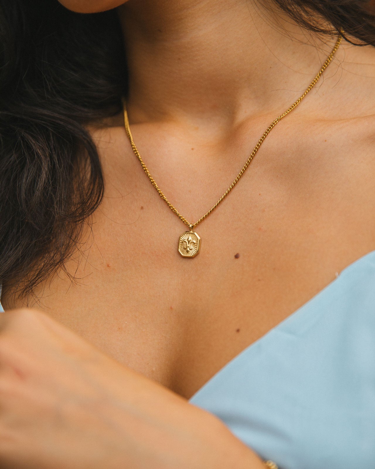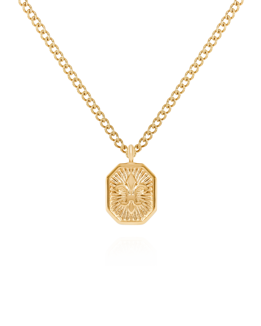 Dante signifies everlasting elegance. With its fleur-de-lis engraving, it represents perfection, light and life. This timeless piece would be a cherished addition to any collection. This necklace features a delicate thin rope chain. Made with 14k gold PVD plated stainless steel, it's waterproof and tarnish-free, so it will stay beautiful wear after wear.