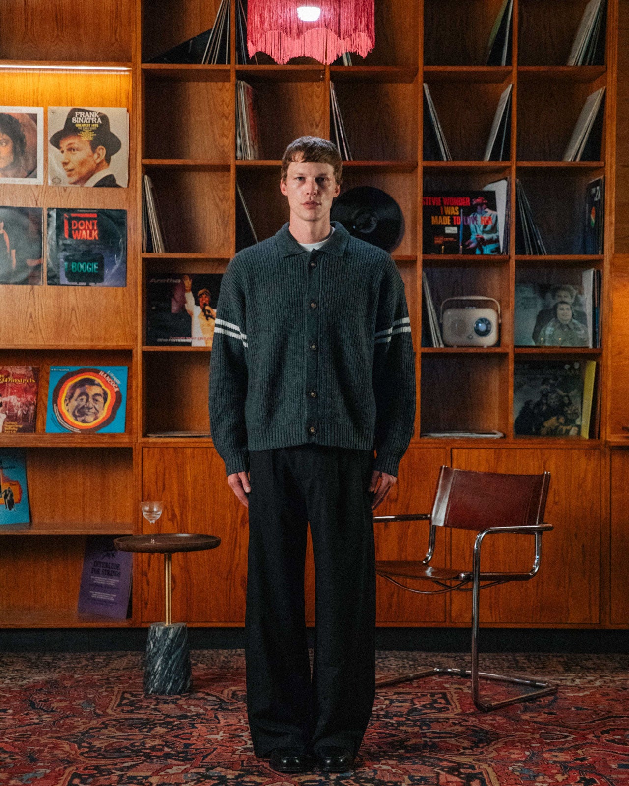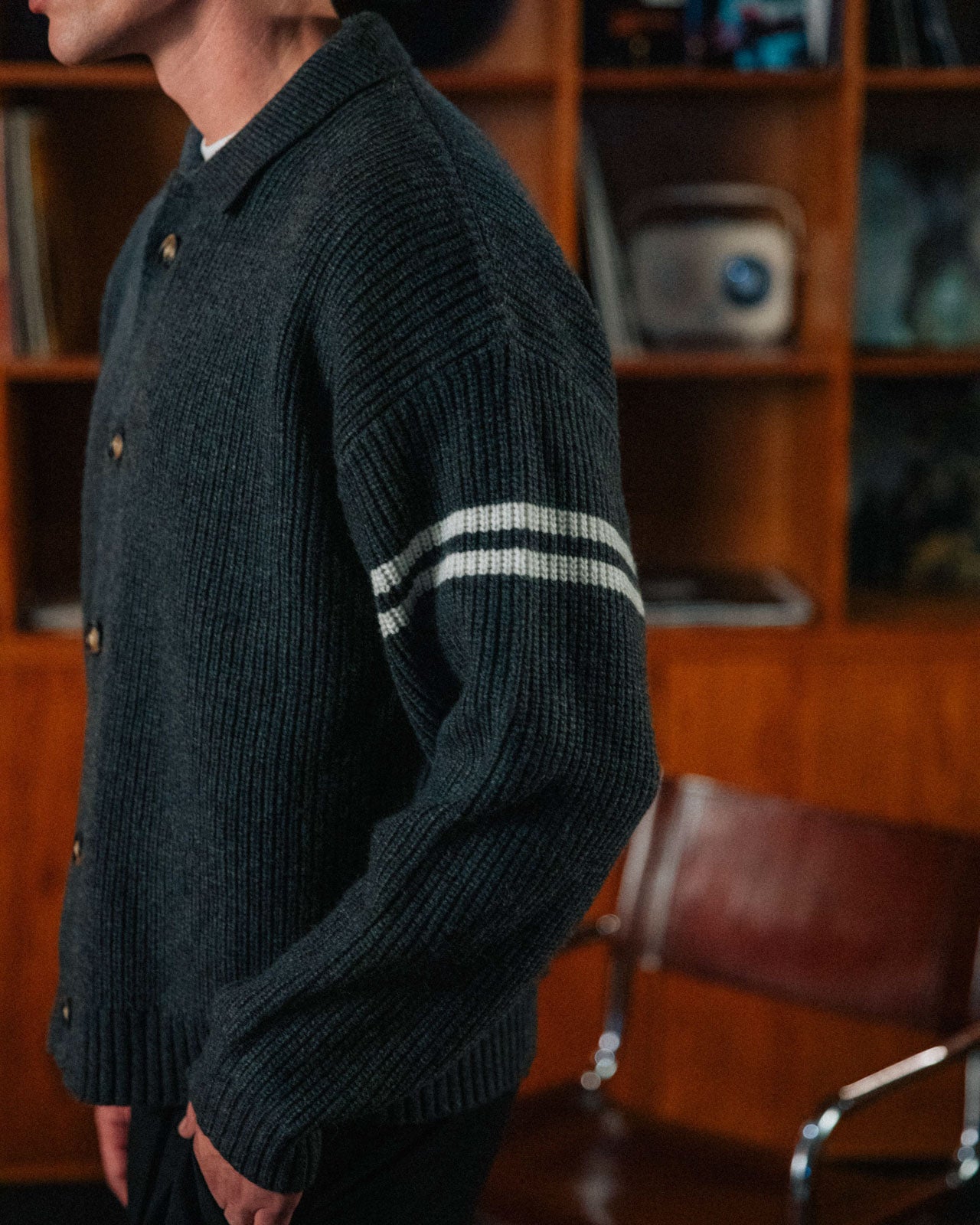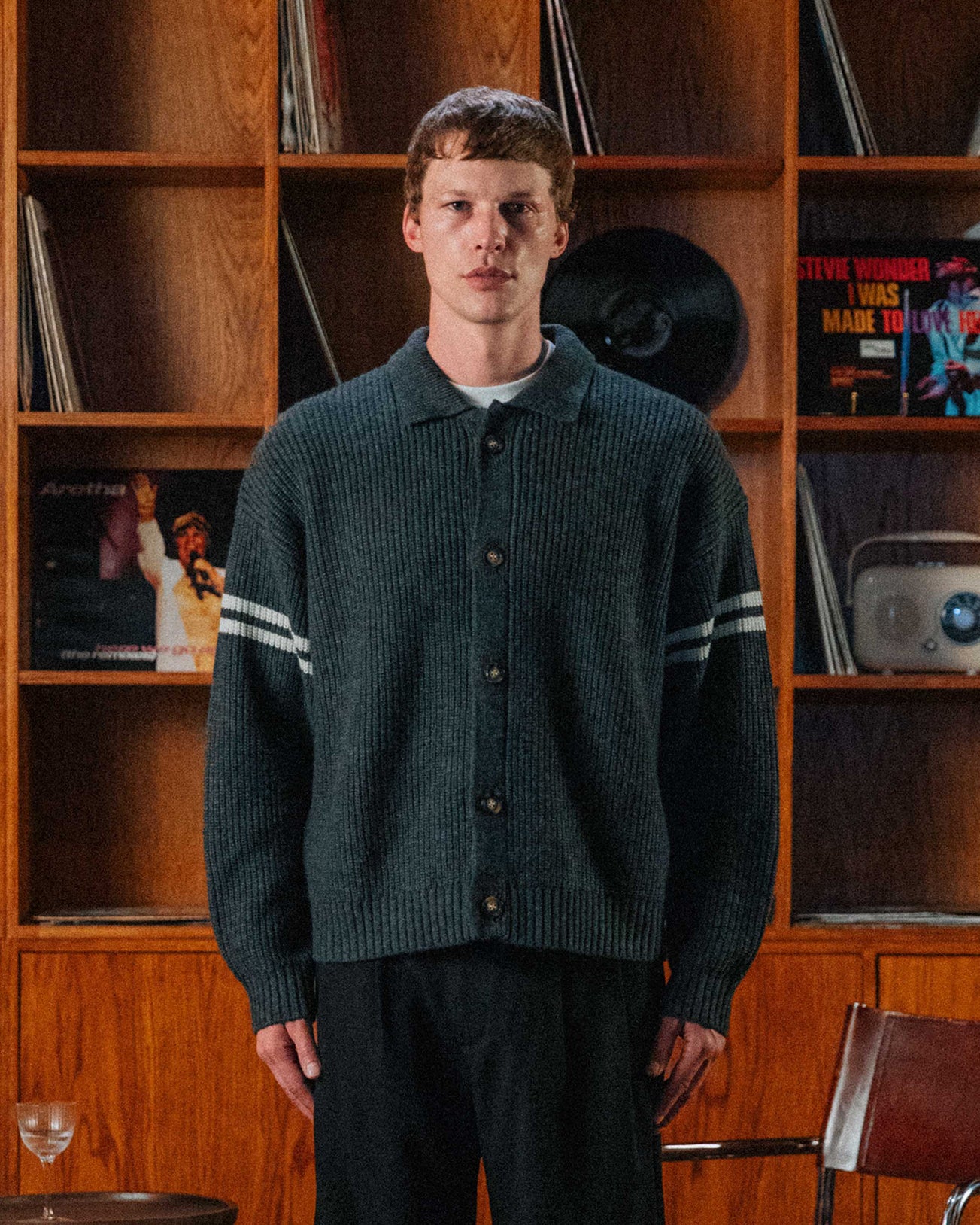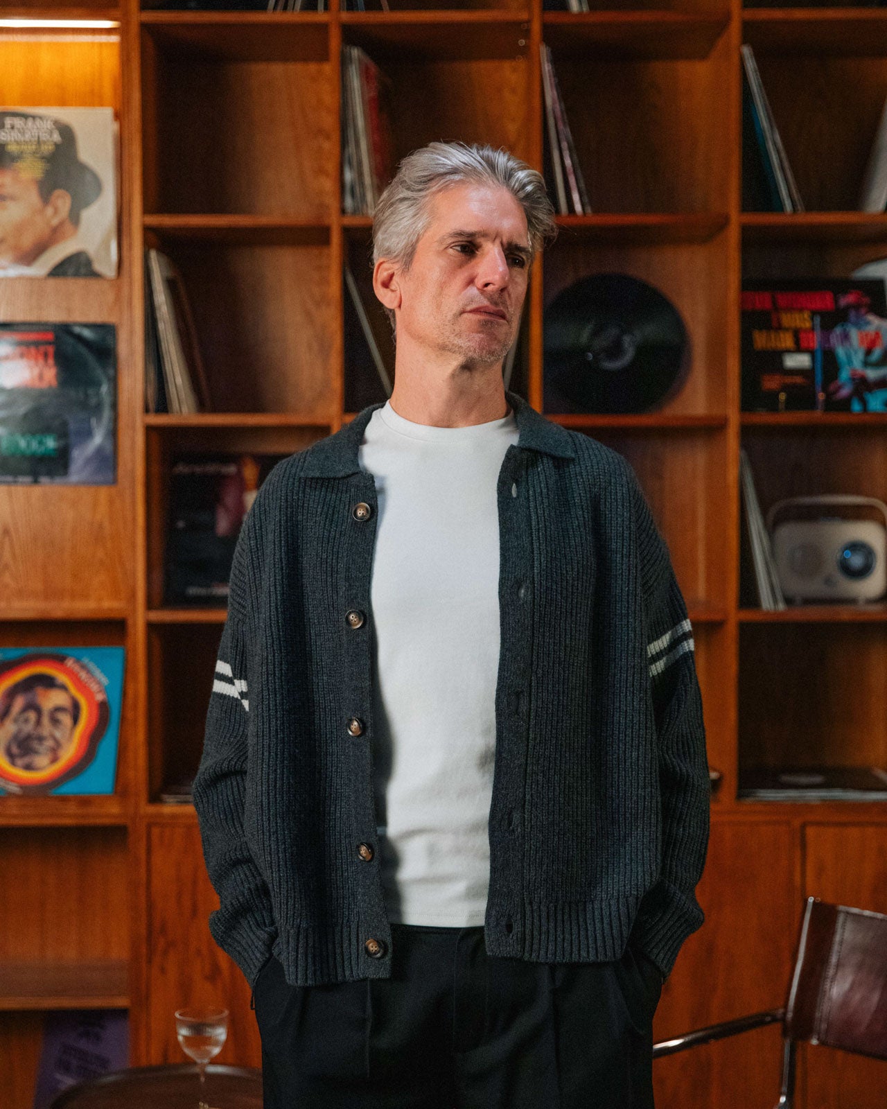 The wool cardigan young Al Pacino would have never taken off. With a relaxed collar, boxy fit and contrast stripes, Emmanuel is the perfect neutral for every day layering. Completed with horn buttons and branded 33mm tab.