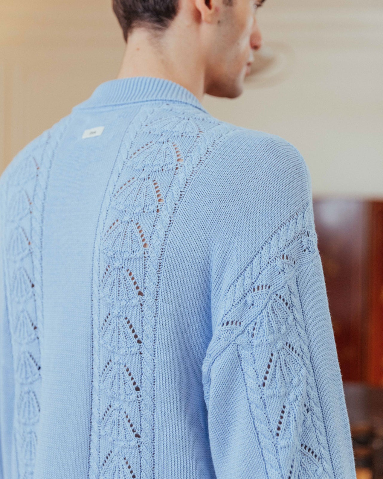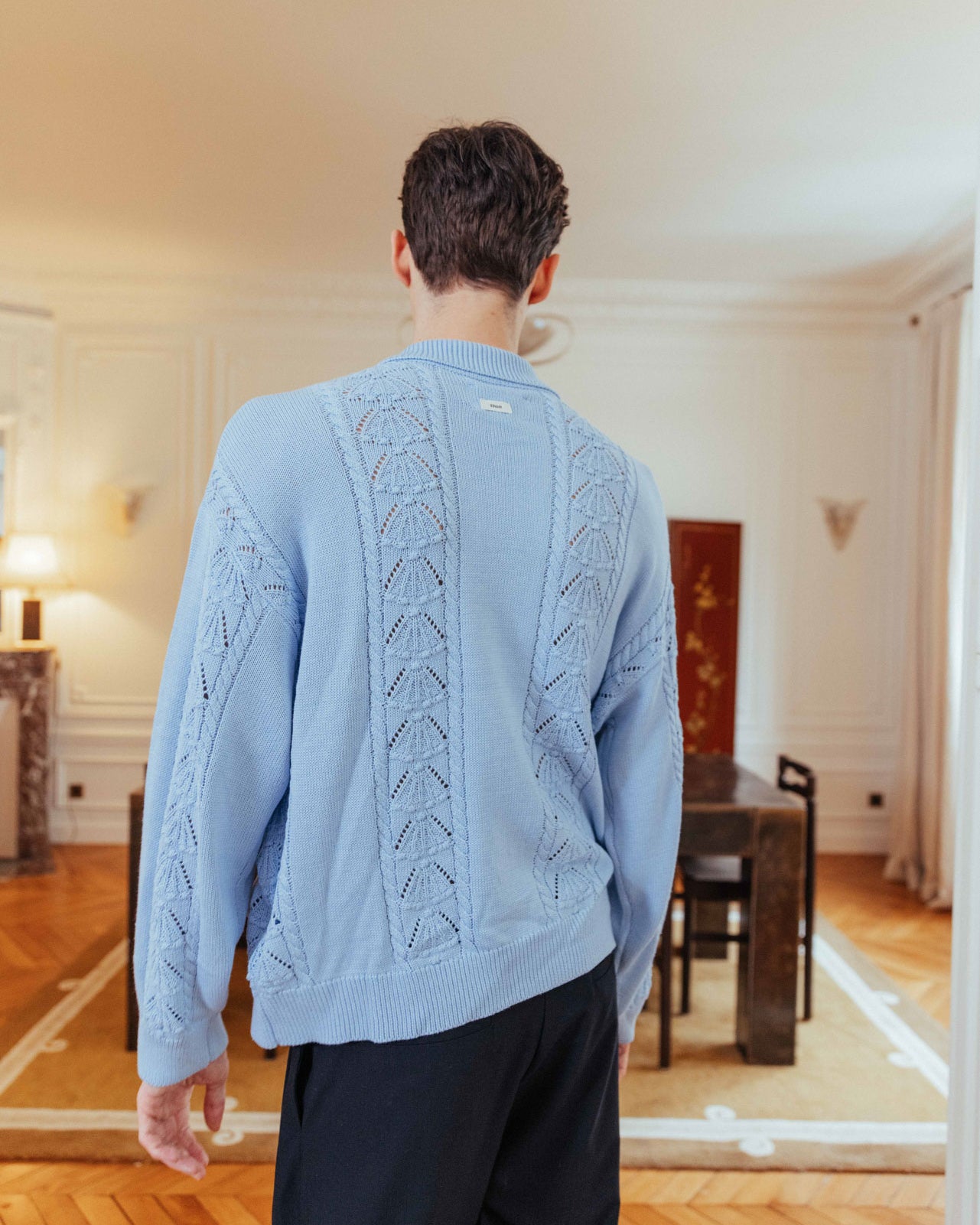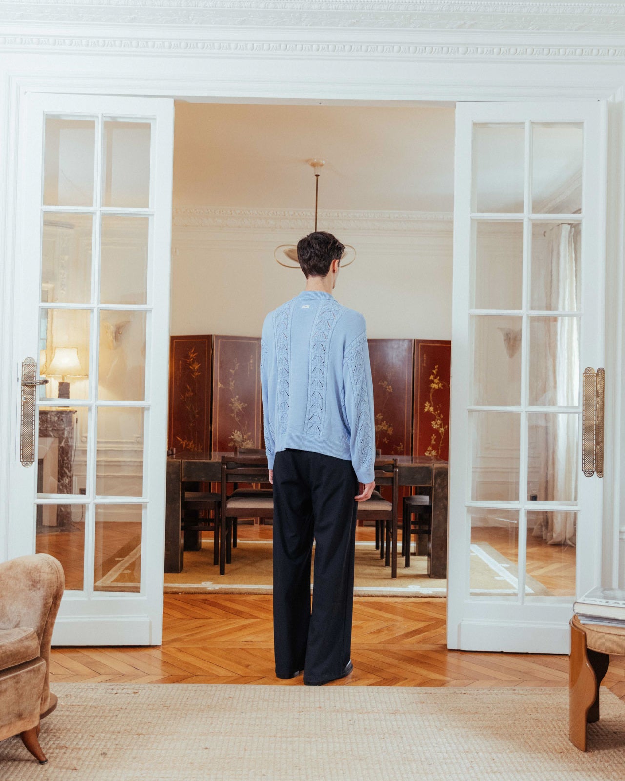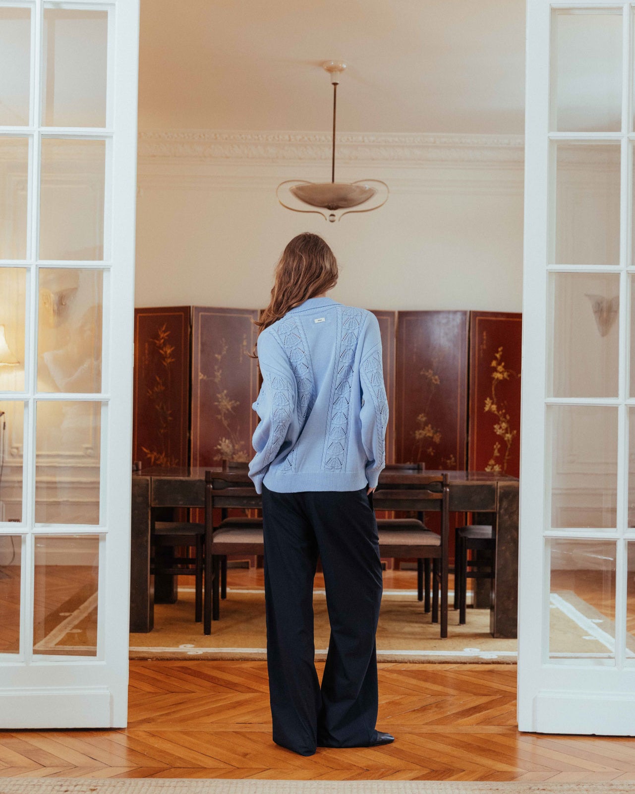 A relaxed knit in a daydreamy sky blue, with pointelle detail reminiscent of the crown moulding in your dream Parisian apartment.