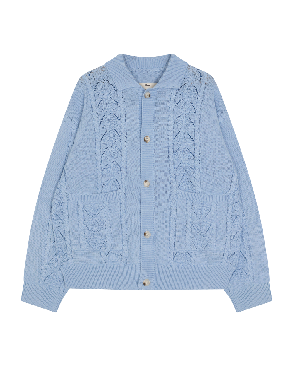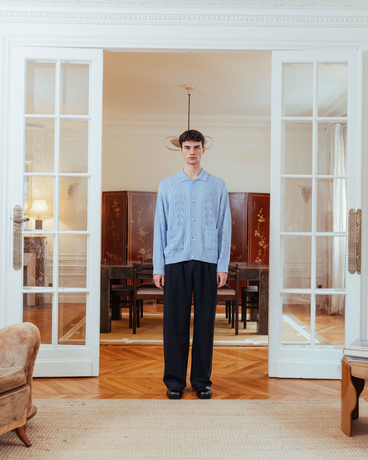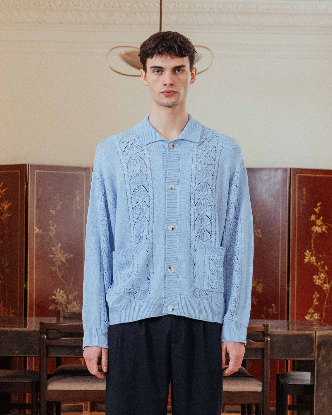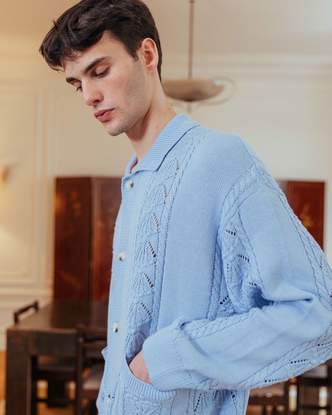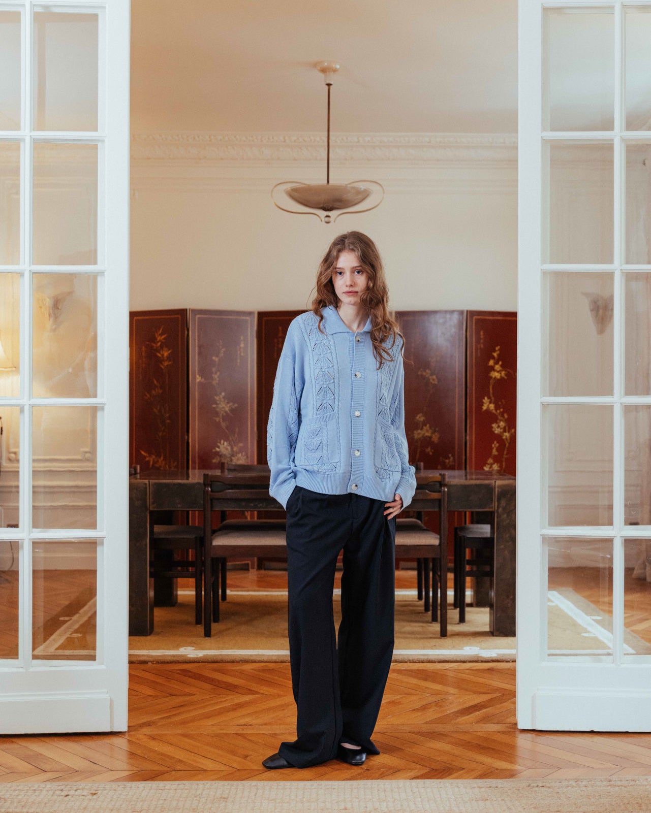 A relaxed knit in a daydreamy sky blue, with pointelle detail reminiscent of the crown moulding in your dream Parisian apartment.