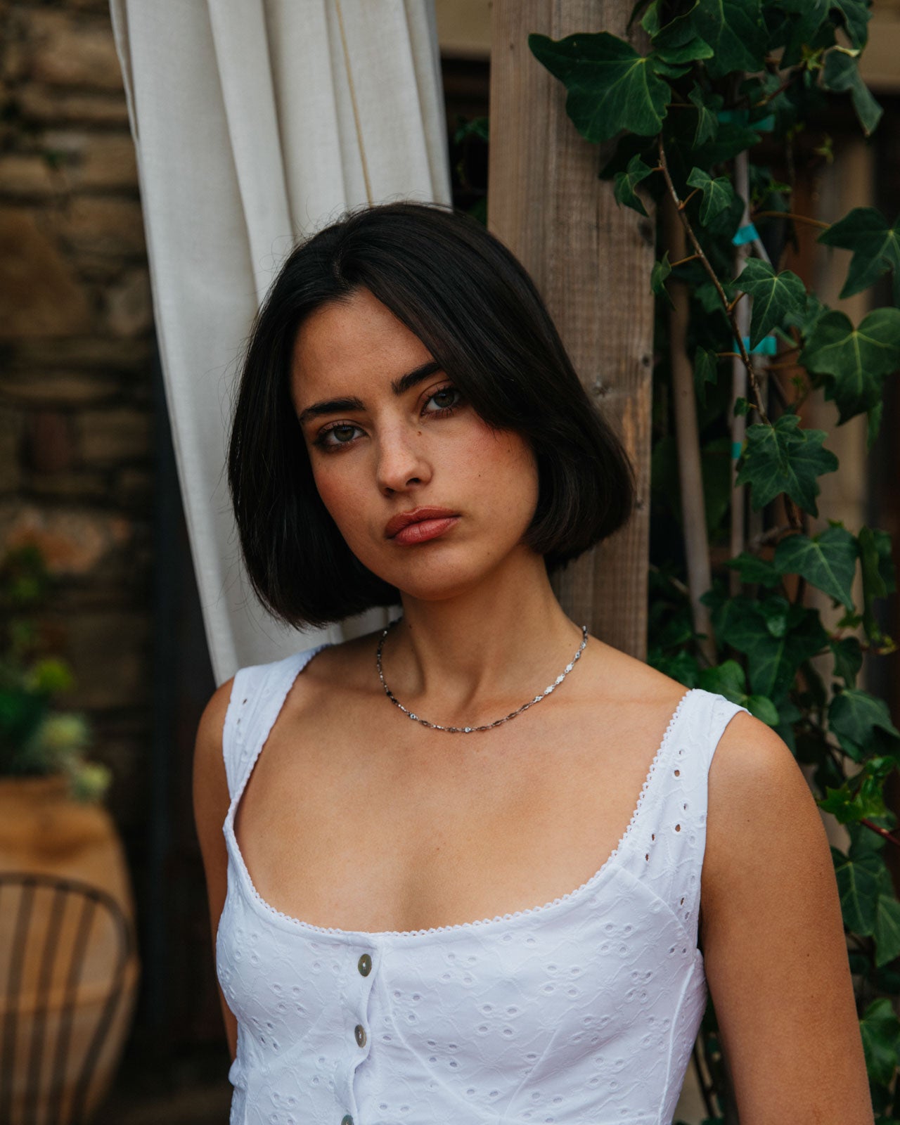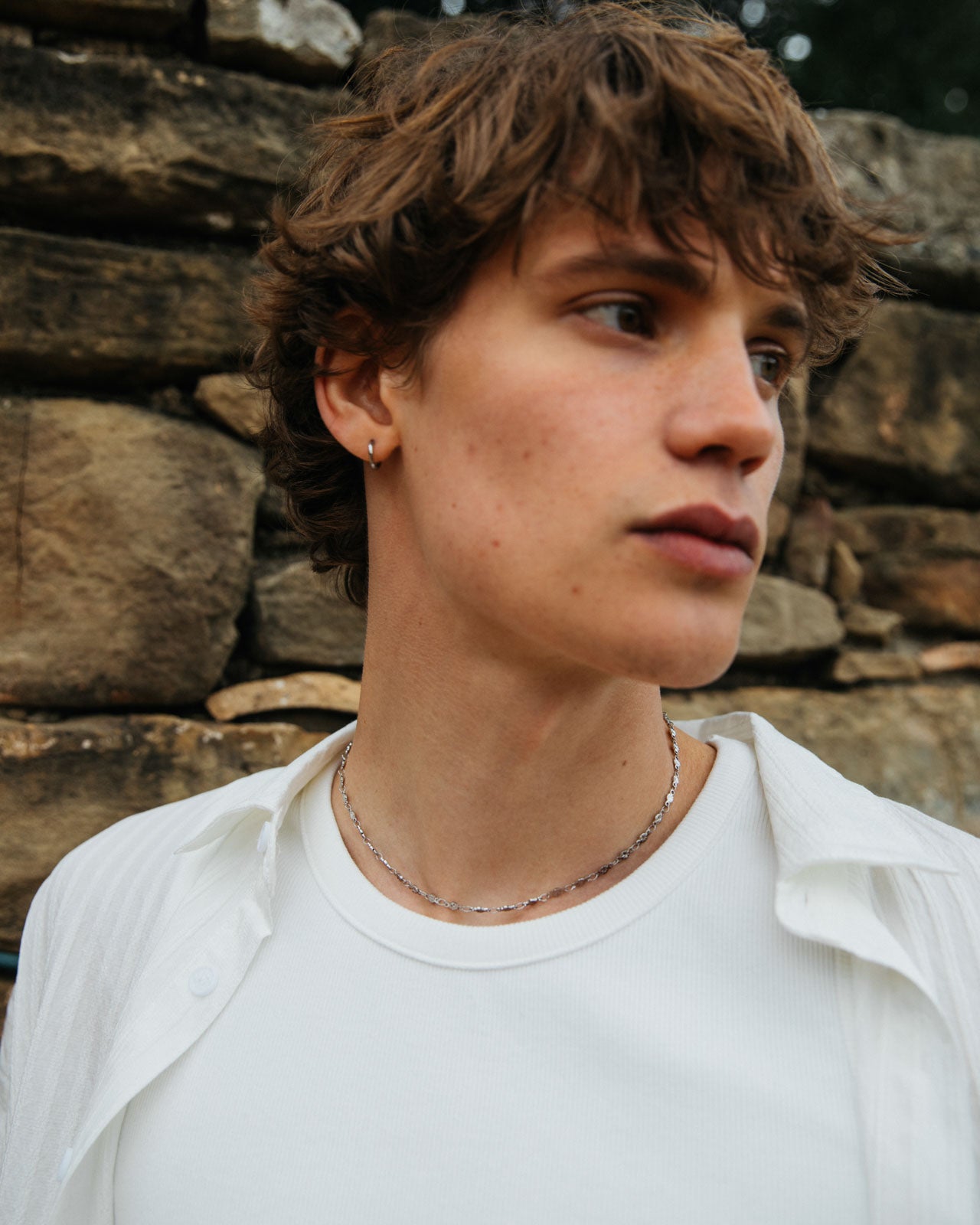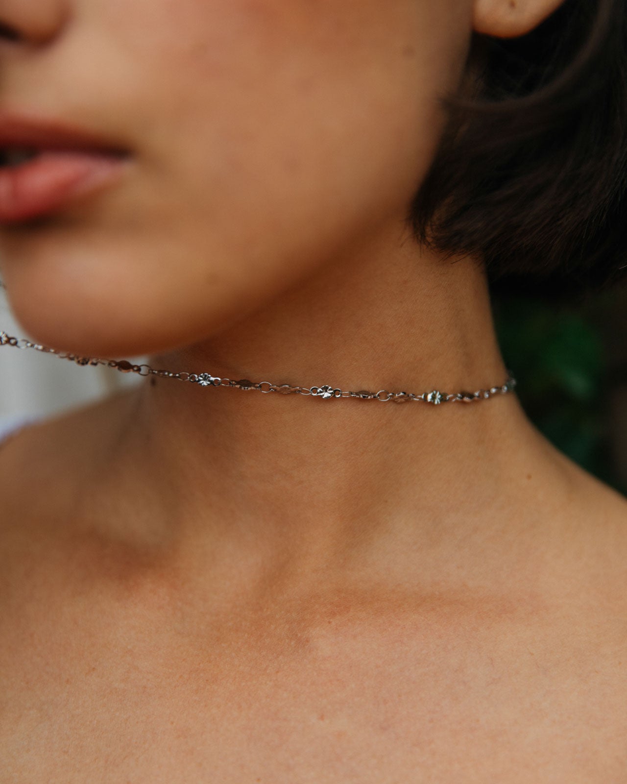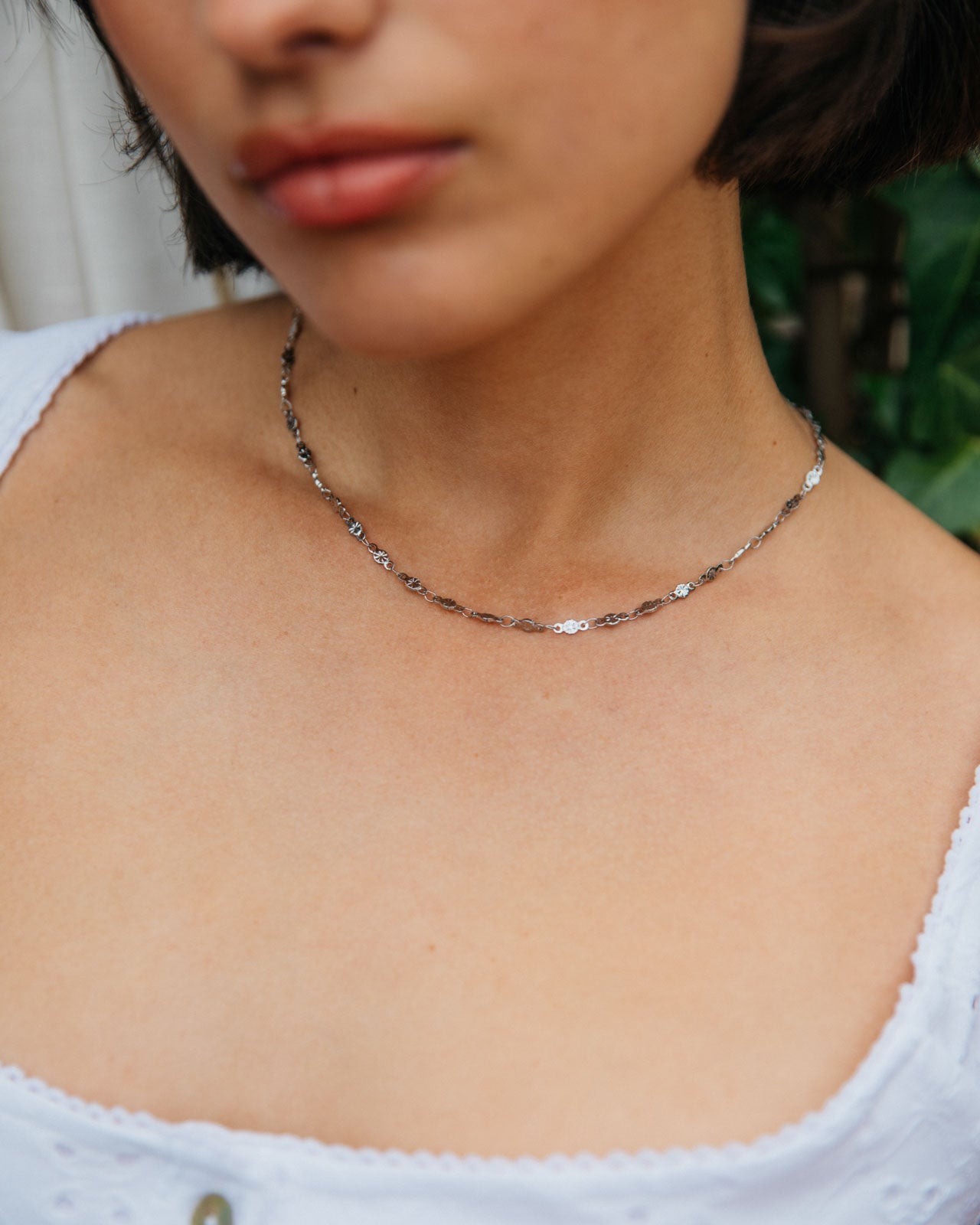 A delicate chain that gets to watch the world from your collar. With intricate chain detailing and some sparkle for extra impact.