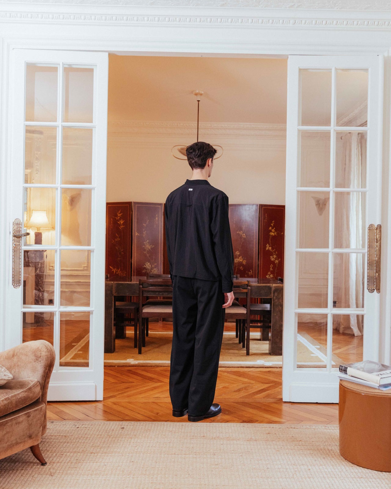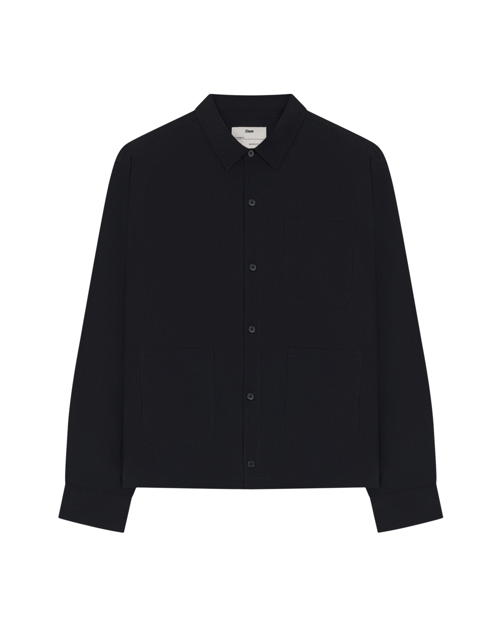 An all black lined overshirt ready for transitional layering. Its boxy fit and lined weighting makes it easily styled open or buttoned, layered, or solo.