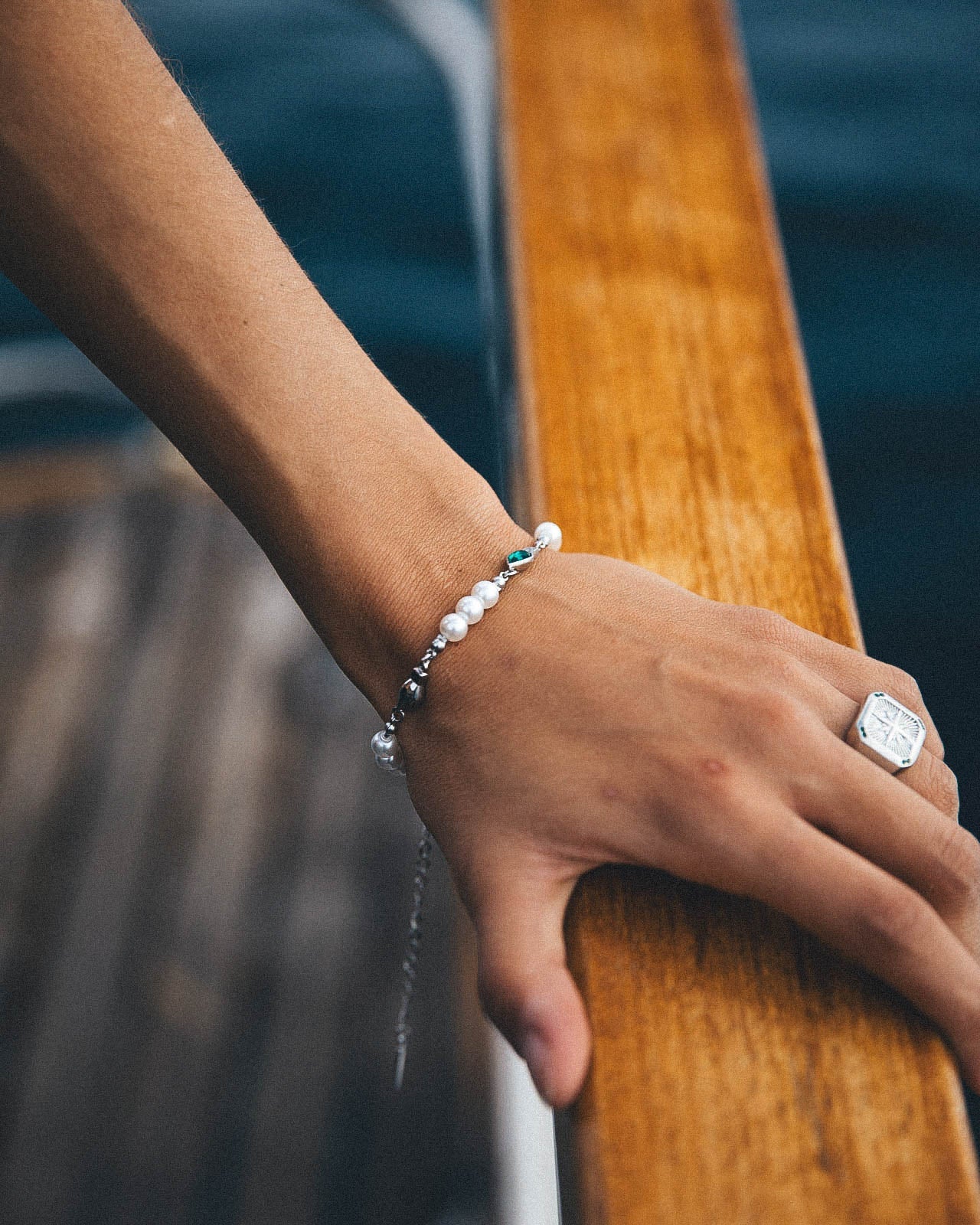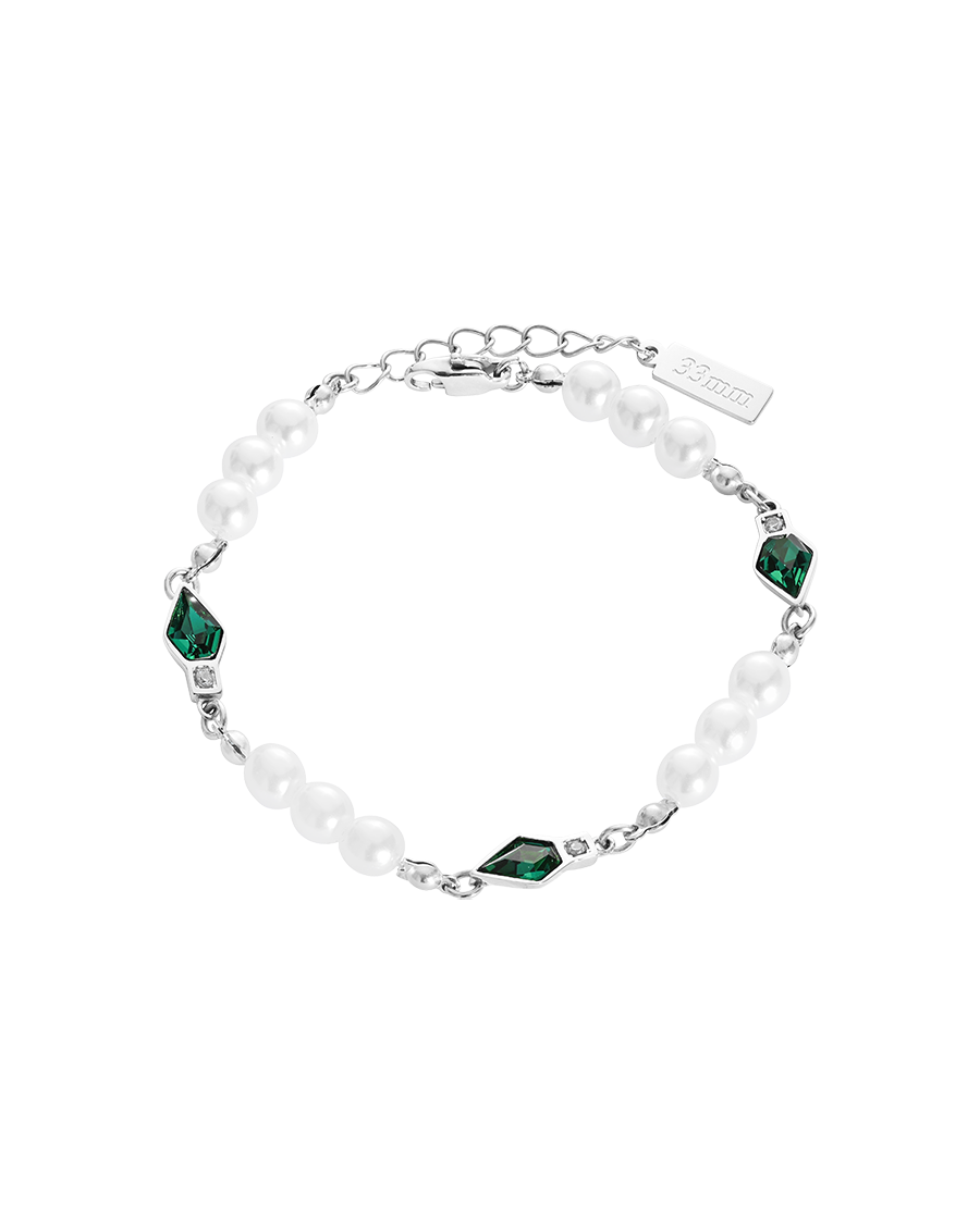 Material: Stainless Steel with Glass Pearls, White Cubic Zirconia & Emerald Green Glass Stones