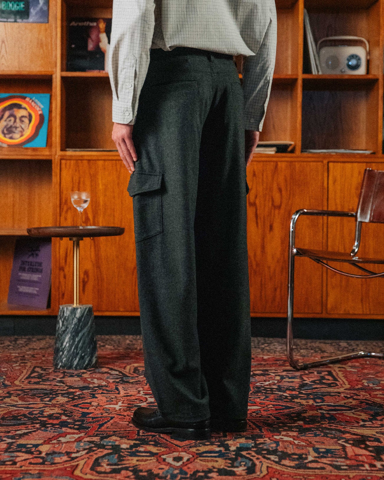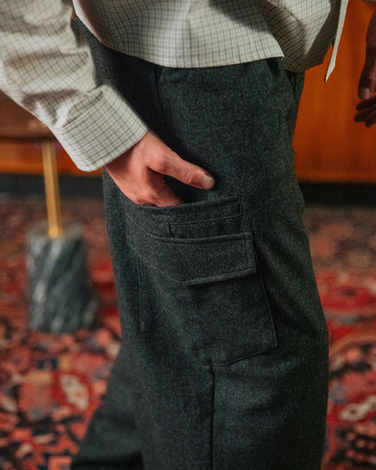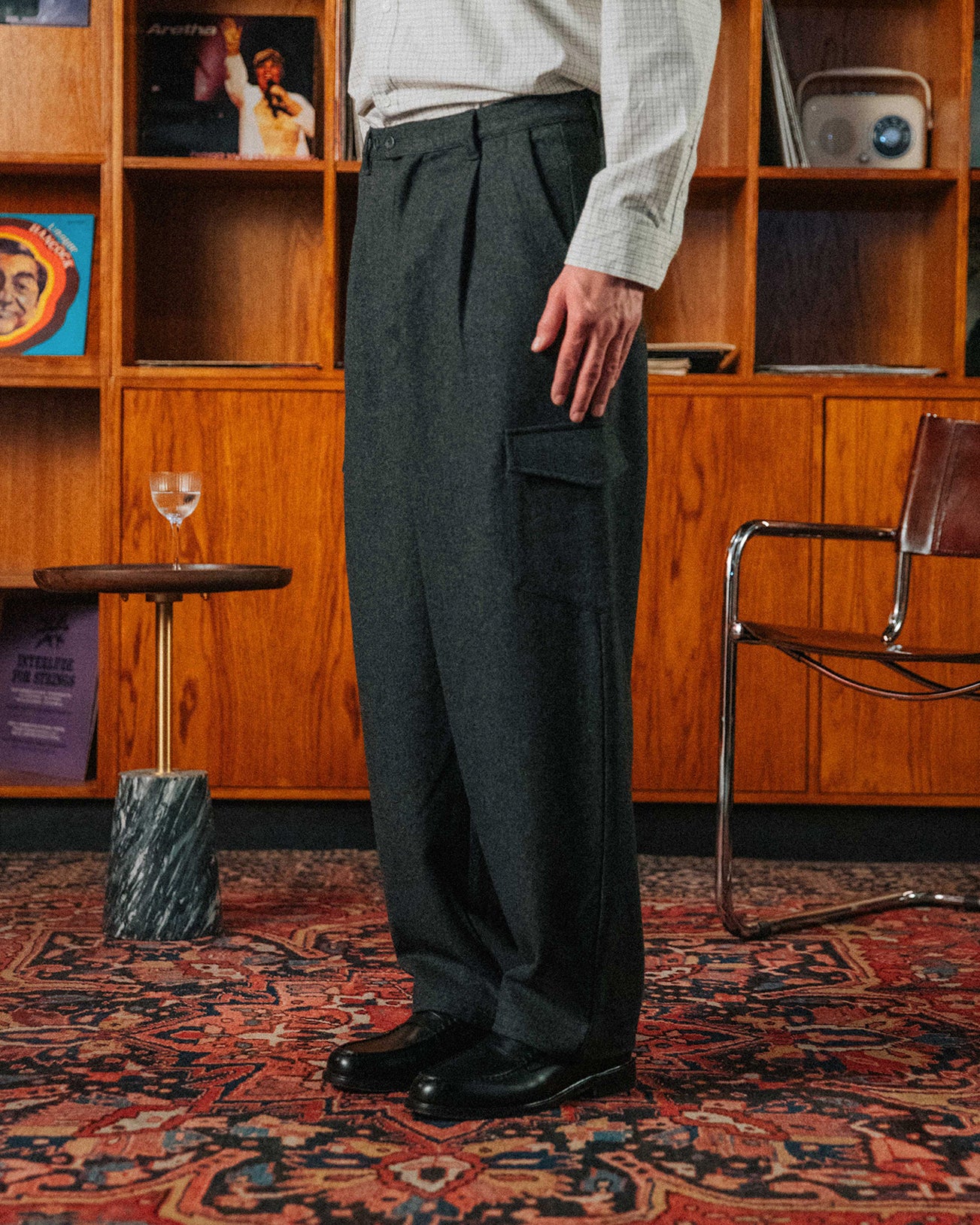 Cargos meet tailoring. In a comfortable wool blend and relaxed barrel leg, Omar brings comfort, whilst leg pockets reignite the utility feeling.