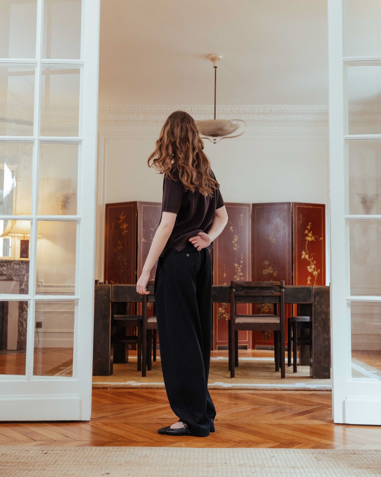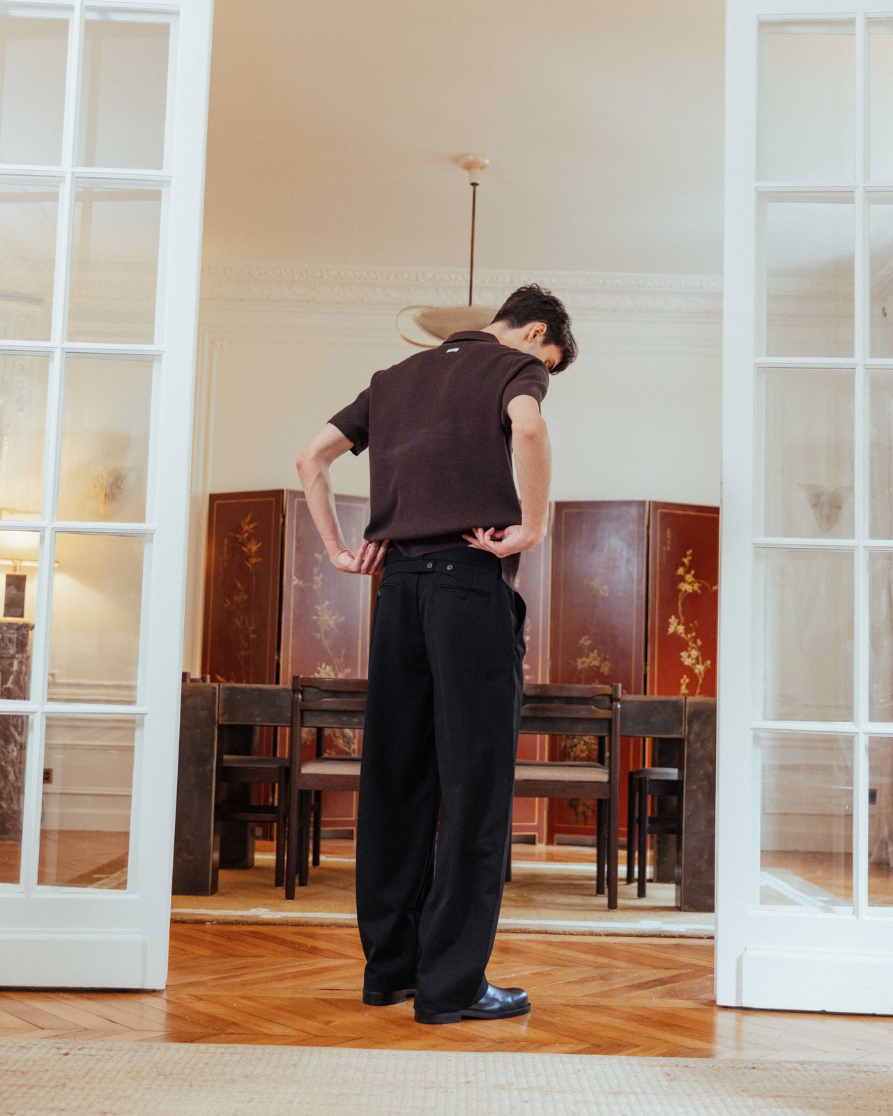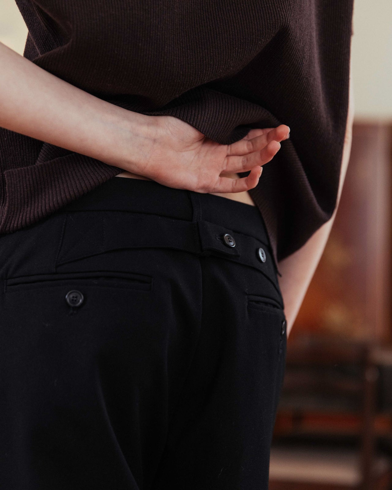 • Back waist adjuster with black horn-effect buttons
